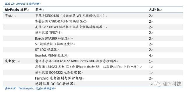 每一臺(tái)Airpods的設(shè)計(jì)和芯片數(shù)都是一樣的。在兩個(gè)耳塞內(nèi)部以及充電盒的主要IC組件及其數(shù)量如下表所示: