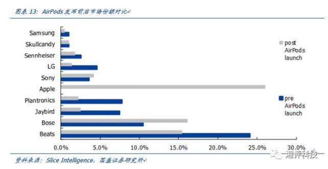 AirPods 在短短一個(gè)月時(shí)間內(nèi)就成為美國最受歡迎的無線耳機(jī),根據(jù)市場調(diào)研機(jī)構(gòu)Slice Intelligence的數(shù)據(jù),發(fā)行短短一個(gè)月已占據(jù)26%的市場份額,超過 Beats 和 Bose 耳機(jī)的份額。