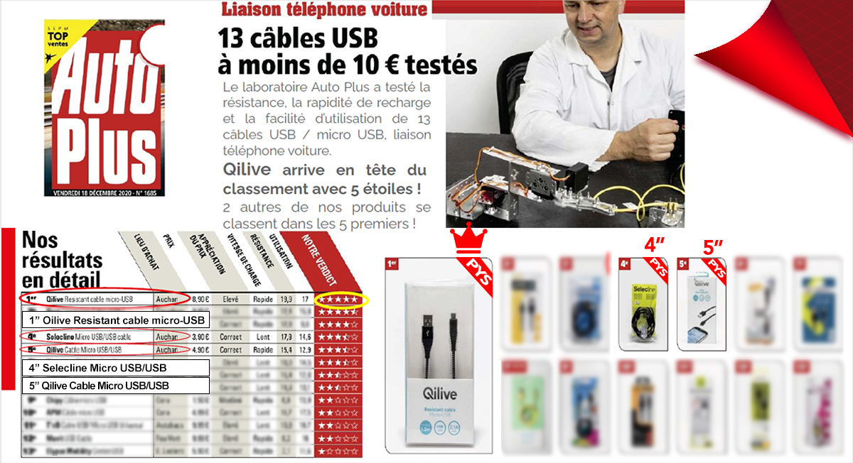 近日,法國專業(yè)機構AUTO PLUS針對USB線材類產(chǎn)品做了一項專業(yè)調查,隨機抽取了市面上的13件此類產(chǎn)品進行嚴格測試(其中包含歐洲TOP1的品牌), 鵬元晟為當?shù)刂闶凵虤W尚生產(chǎn)的Qlive和Seleclive系列產(chǎn)品以阻抗弱,充電速度快,耐折性強的特性獲得五星高分,榮居榜首!